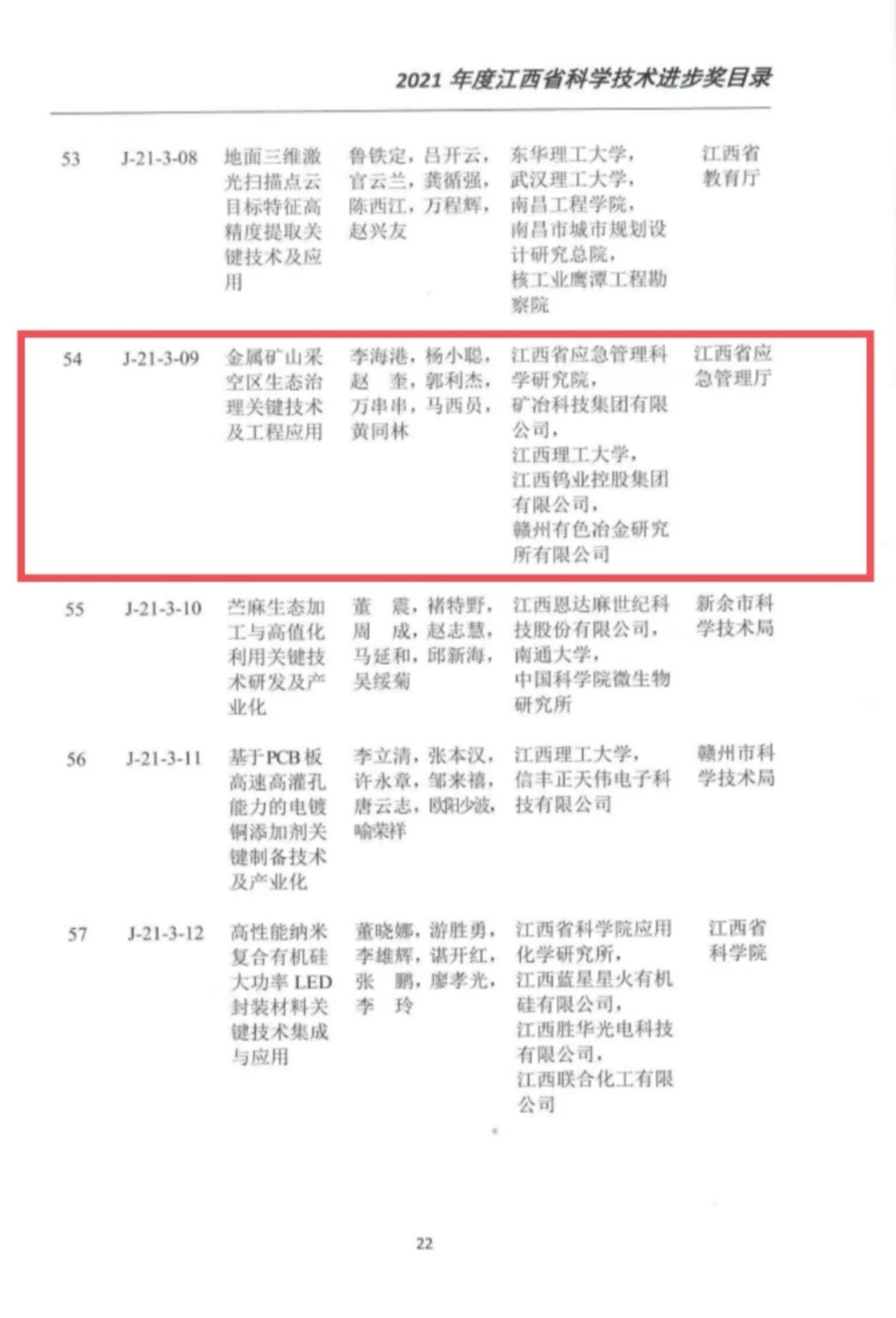 8月18日,省委、省政府召開全省科技創(chuàng)新大會(huì),會(huì)議表彰了2021年度江西省科學(xué)技術(shù)獎(jiǎng)獲獎(jiǎng)成果,省應(yīng)急管理科學(xué)研究院聯(lián)合礦冶科技集團(tuán)有限公司、江西理工大學(xué)、江西鎢業(yè)控股集團(tuán)有限公司共同申報(bào)的“金屬礦山采空區(qū)生態(tài)治理關(guān)鍵技術(shù)及工程應(yīng)用”成果榮獲江西省科技進(jìn)步三等獎(jiǎng),首次以第一承擔(dān)單位榮獲省科技進(jìn)步獎(jiǎng),標(biāo)志著省應(yīng)急廳與國(guó)家級(jí)大院大所的科創(chuàng)平臺(tái)合作運(yùn)行取得了顯著成效。