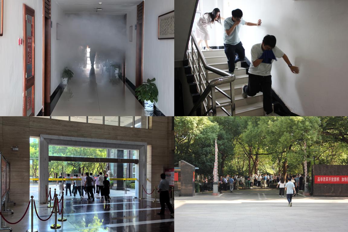 9月29日下午3點,演練正式拉開帷幕。演練預設場景為某樓層一辦公室起火并冒出大量濃煙,消防控制室內(nèi)火災報警器響起,大樓值班人員通過火災自動報警裝置及樓層監(jiān)控設備,及時研判樓層火情并報告。根據(jù)應急疏散預案要求,工作人員立即啟動警報,廣播緊急撤離,同時引導大樓內(nèi)干部職工經(jīng)由安全通道快速疏散。警報響起后,大家反應迅速,以濕毛巾捂口鼻、彎腰低姿的應急疏散姿勢,從安全通道快速有序地疏散至廳辦公大樓門口。